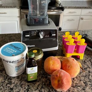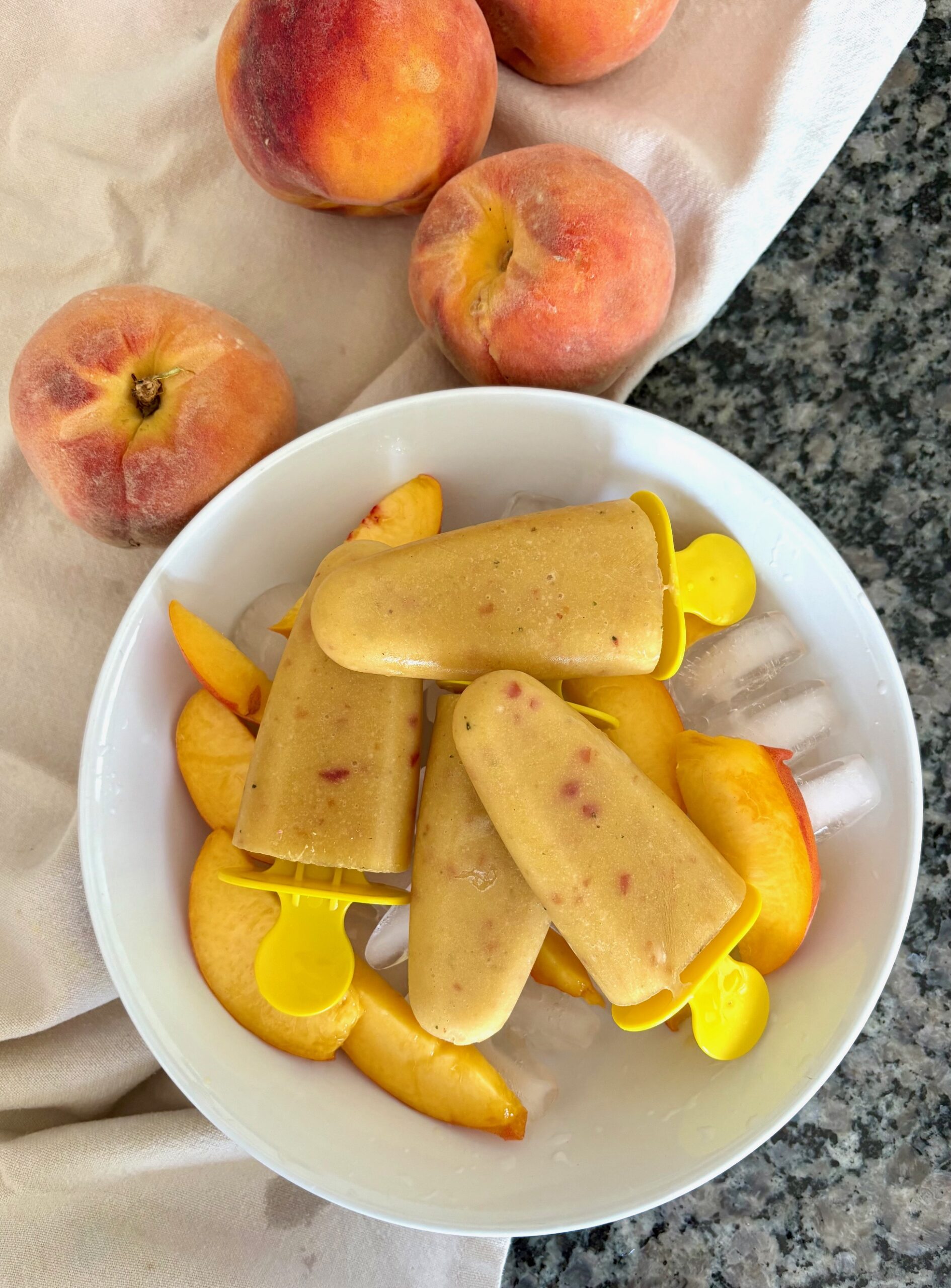 It’s officially the height of peach season here in Colorado! One of our neighbors was selling peaches for her school fundraiser so I bought a box, not knowing at the time that it was a HUGE box of more peaches than I would know what to do with. I shared some with family members and still had more than enough left for us so this past week I’ve been in peach mode making as many peach recipes as possible. I stuck with some of my favorites like our Summer Peach Crisp, my childhood favorite Peach Chicken and I sliced and froze some for colder months when I love to make our Chipotle Peach Crock Pot BBQ Chicken. But I also tested out some new recipes and a big success were these Peachy Popsicles – I made them with our kids in mind, but I love them so much too!
