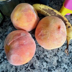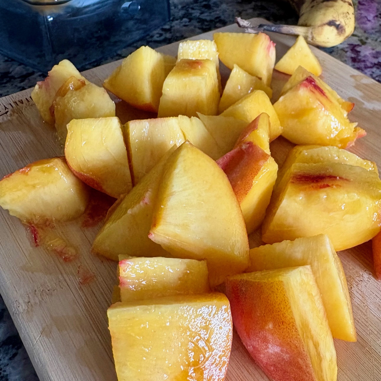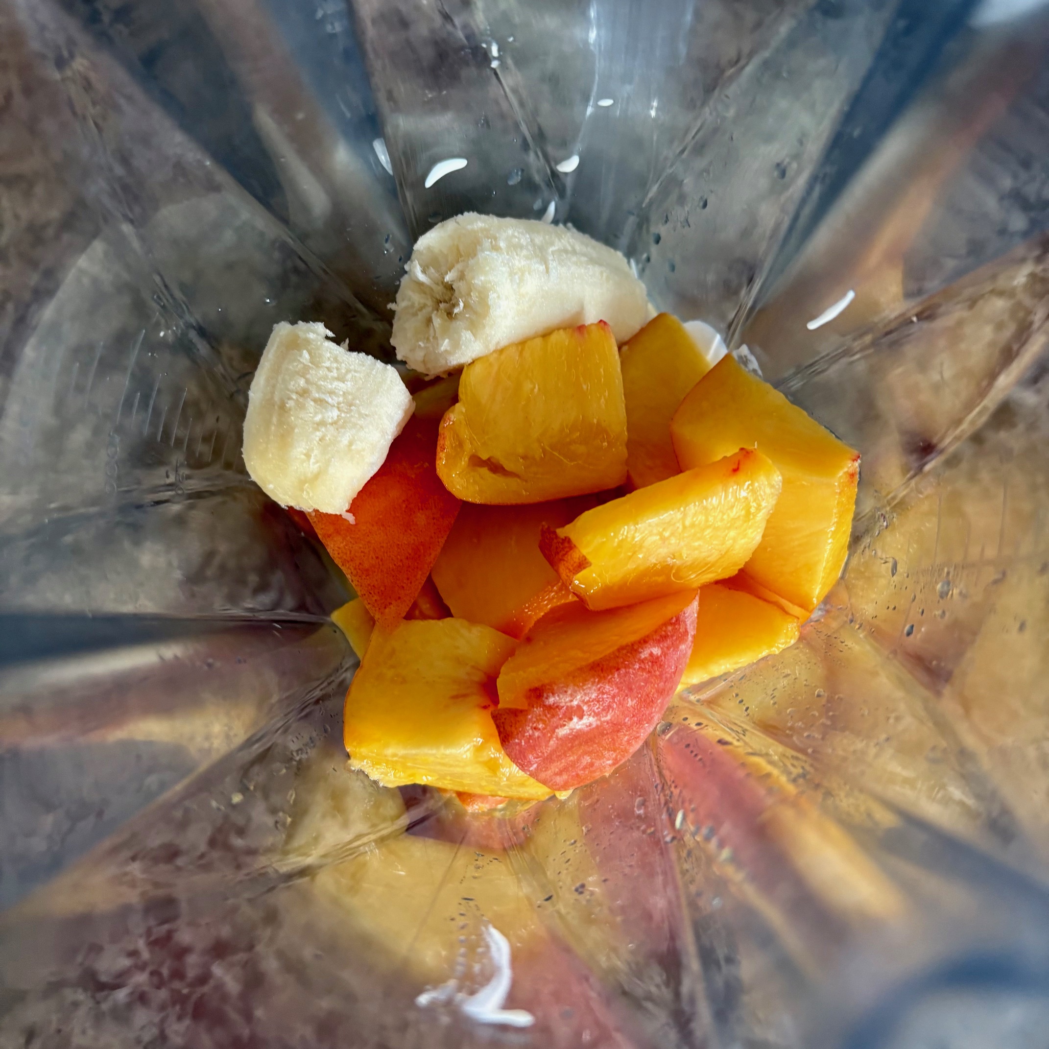 1. Place all ingredients in the blender and blend until it reaches a smoothie-like consistency (a few remaining peach chunks are totally fine)