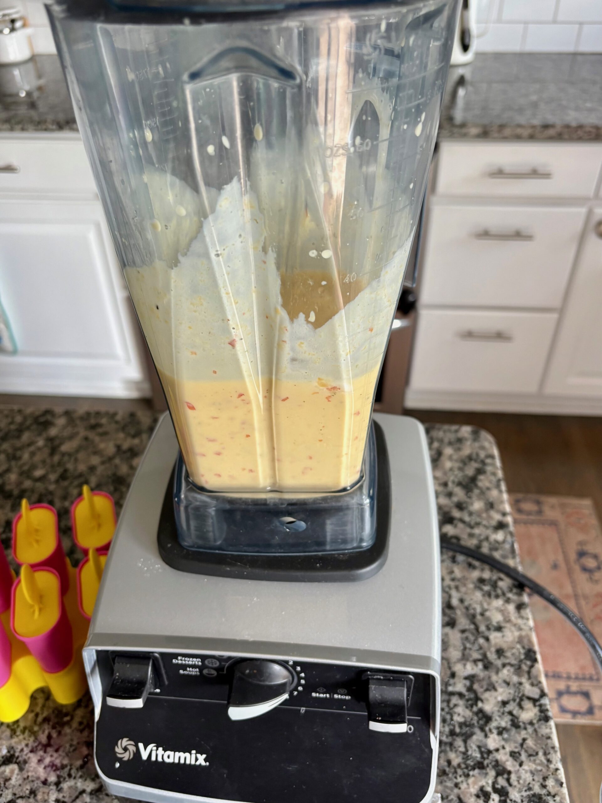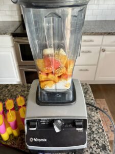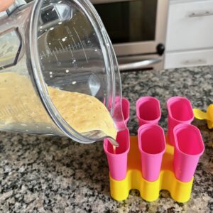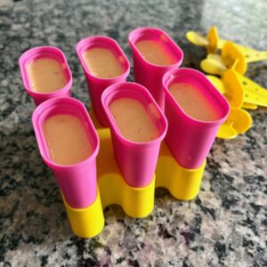Blend everything together in your blender and get your popsicle molds ready to pour it in. You can find molds in a lot of stores or online. We got these very flashy ones from Ikea a few years ago and my daughter just loves them so we keep on using them haha. If you can’t find any, you can always use some of the mini paper cups with popsicle sticks too! Another note here is that depending on the size of the popsicle molds you have, you may have some leftover mixture – our molds are smaller than most so this was the case for me. You can always freeze it in a different vessel (or paper cups) or you can use it as a base for a smoothie when you’re done!